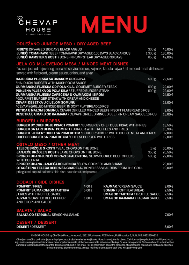 Chevap house Restoran koji nudi široku ponudu hrane i pića. Savršen izbor za one koji žele bogatiji kulinarski doživljaj. Popularno Desetka u somunu Sporo kuhani juneći obrazi Gurmanska pljeskavica Juneći Tomahawk Lokacije Strožanac Jurasova ul 1, Podstrana 21312 Detalji Chevap house Instagram